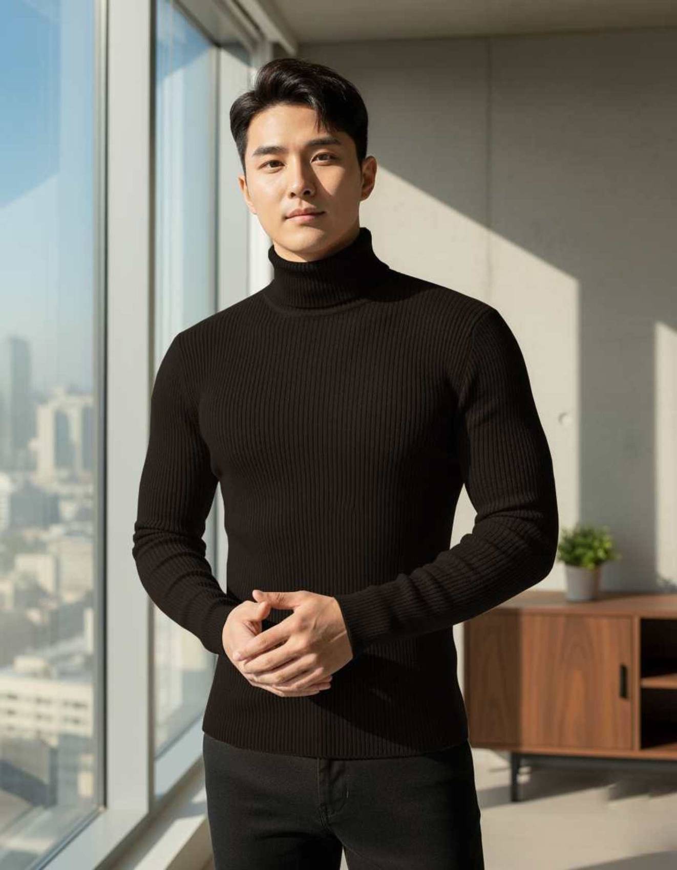 Cat Bunny Solid High Neck Casual Men Brown Sweater