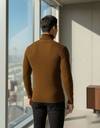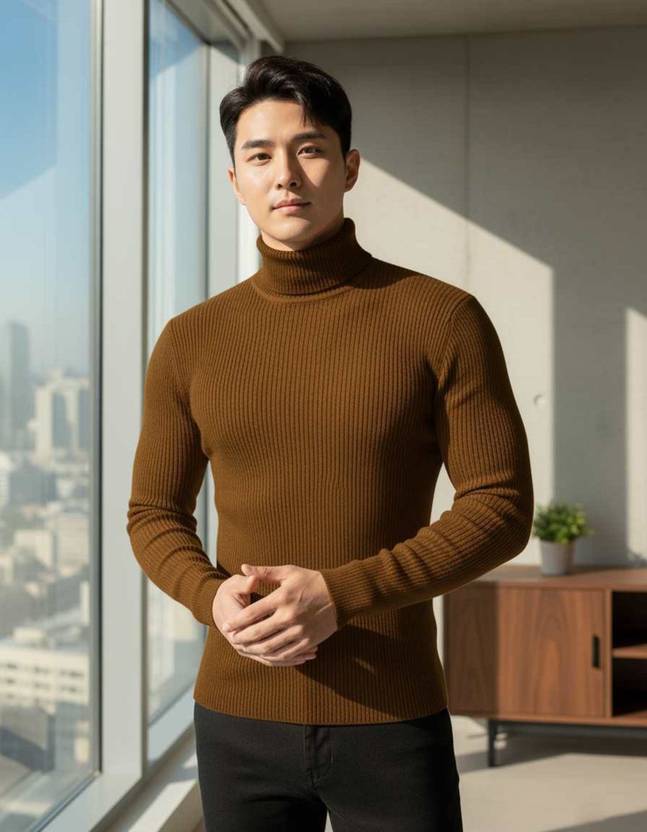 Cat Bunny Solid High Neck Casual Men Brown Sweater