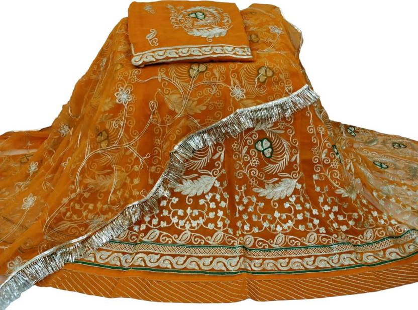 Rajputi poshak is a traditional form of embroidery done in India. The design consists of small flowers, leaves or motifs arranged in an intricate pattern on cloth. This beautiful work is done using zari thread.