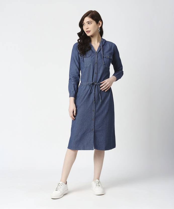Collared Dress, Fit & Flare, Denim, Fit & Flare, Knots and Tie ups, Knots & Gathers, Midi Dress, Waist Tie Dress, Midis, Workwear - Classy Solids