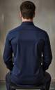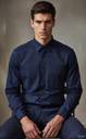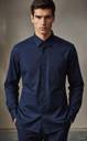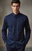 This is a navy blue, long-sleeved button-down shirt featuring a classic collar. It is designed with two patch pockets on the chest and two additional larger patch pockets near the hem. The shirt has a smooth fabric texture and appears to have a regular fit. It can be paired with trousers, jeans, or chinos.