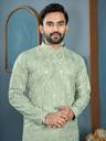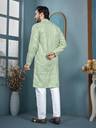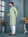 Bring home a perfect blend of elegance and festive charm with this stylish men’s ethnic kurta. Designed for modern men who love traditional fashion, this kurta features fine 7mm sequin (sikvans) detailing that adds a subtle shine and premium look. The refreshing pastel green shade gives a rich and graceful appearance, making it an excellent choice for special occasions.