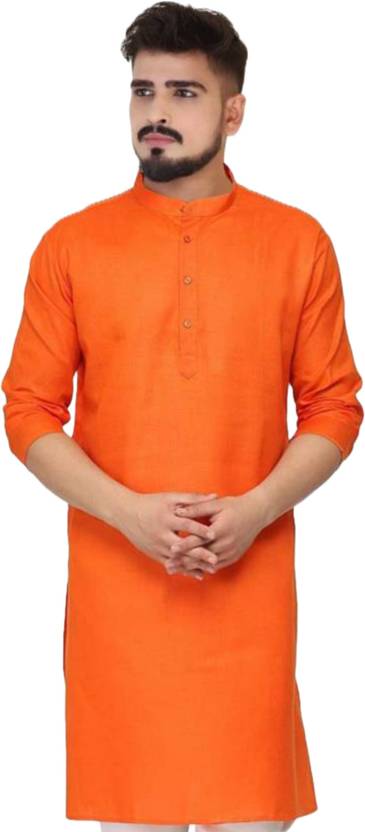 Men Solid Cotton Blend A-line Kurta (Orange)