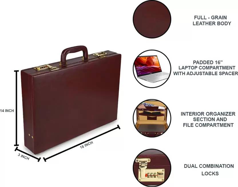 CGC Leather briefcase is made of 100% PU leather which looks even better with age, it is perfect for any business profile and give us a classic look::Craftsmanship, stitches and parts: our products are handmade by professionally skilled craftsmen, because of which the briefcase have best finishing in its class. Brass/ metal fitting lock/buckles and holders are internally lined with strong brown lining make it durable and long-lasting. Every stress point on this bag is double-stitched and riveted or reinforced with hidden nylon strapping::It is suitable for your daily life, traveling, shooting, college, university, office, board meeting, business purposes, etc. Perfect for office executives, lawyers, military personnel, businessmen and who love classic office briefcases.