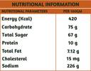 • Per 100 gm : Energy : 420 (kcal) ,Total Fact:10g , Saturated fat : 6g, Trans Fat :0g , Cholesterol:15mg ,Sodium:226mg, Carbohydrate:75g , Dietary Fiber :2g , Total Sugar :67g , Added Sugar :42g , Protein :10g,Vitamin D :32 mcg , Calcium :221mg , Iron:1mg , Potassium :1745mg
