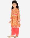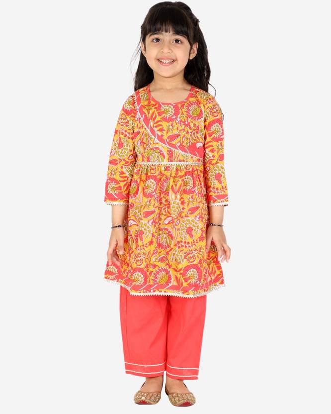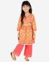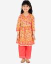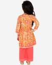 Girls Peach Jaipuri Printed Angrakha Kurta with Plazo Pants with Bunch of Tassles is a beautiful traditional piece. Very attractive and easy to wear ethnic apparel for your little one.