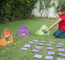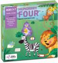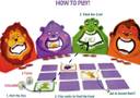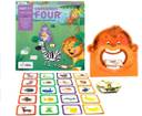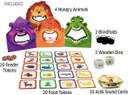 4 Cardboard animals, 20 food cards, 10 Act, sound cards, 20 feeder tokens, 2 wooden dice, 2 eye masks, play guide/instructions