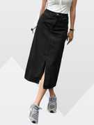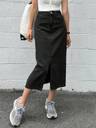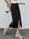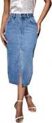 woman wearing a high-waisted, dark blue denim maxi skirt with a prominent front slit that reaches above the knee. The skirt has a classic five-pocket design and features a button and zipper closure. The denim has a slight faded wash for a vintage look. She is also wearing white low-top sneakers, giving the outfit a casual and stylish appearance. The background is a minimalistic indoor setting with light-colored walls and wooden flooring.