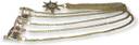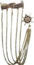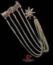 Traditional brooch in brass color studded with kundans and crystal rhinestones. Green epoxy and a red drop shaped bead in the center and a dangling green bead. Ideal for both men and women for the traditional/wedding wear.
