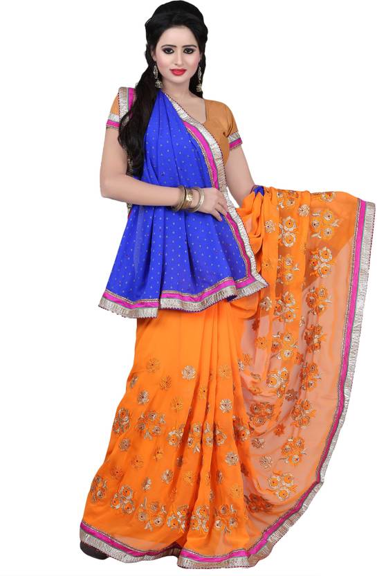 Chandra Silk Mills Embroidered, Embellished Bollywood Handloom Cotton Blend, Art Silk Saree (Blue, Orange)