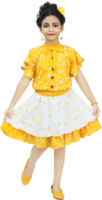 Enhance your daughter’s wardrobe with this trendy skirt-top set from Chandrika that offers both style and comfort. The Fit and flare top is adorned with cute frills and buttons for design. The Skirt has a mid length flare with foliage print. This unique combination is going to add an oomph factor to your daughter’s style. It is a must have for this festive season.