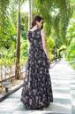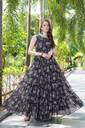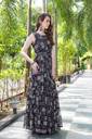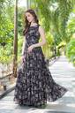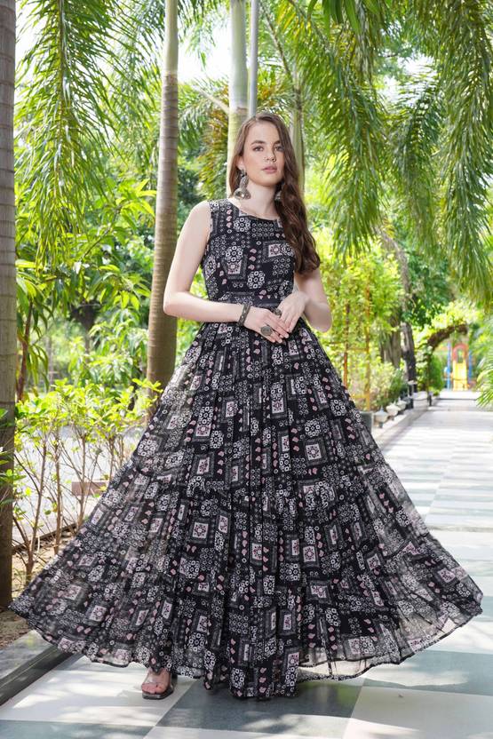 This stunning black georgette gown with a belt is a perfect blend of elegance and contemporary style. The gown features intricate white and soft pink block-printed motifs that beautifully contrast against the rich black base, adding a touch of timeless sophistication. The sleeveless, tailored bodice offers a sleek, fitted look, while the belt cinches the waist to create a flattering silhouette. The gown flows into a voluminous, tiered skirt that adds a sense of movement and grace, making it ideal for special occasions. The lightweight georgette fabric ensures comfort, while the modern design paired with subtle prints makes it versatile for both day and evening wear. Accessorized with oversized sunglasses, statement earrings, and minimal sandals, this gown effortlessly balances charm, poise, and fashion-forward appeal.