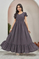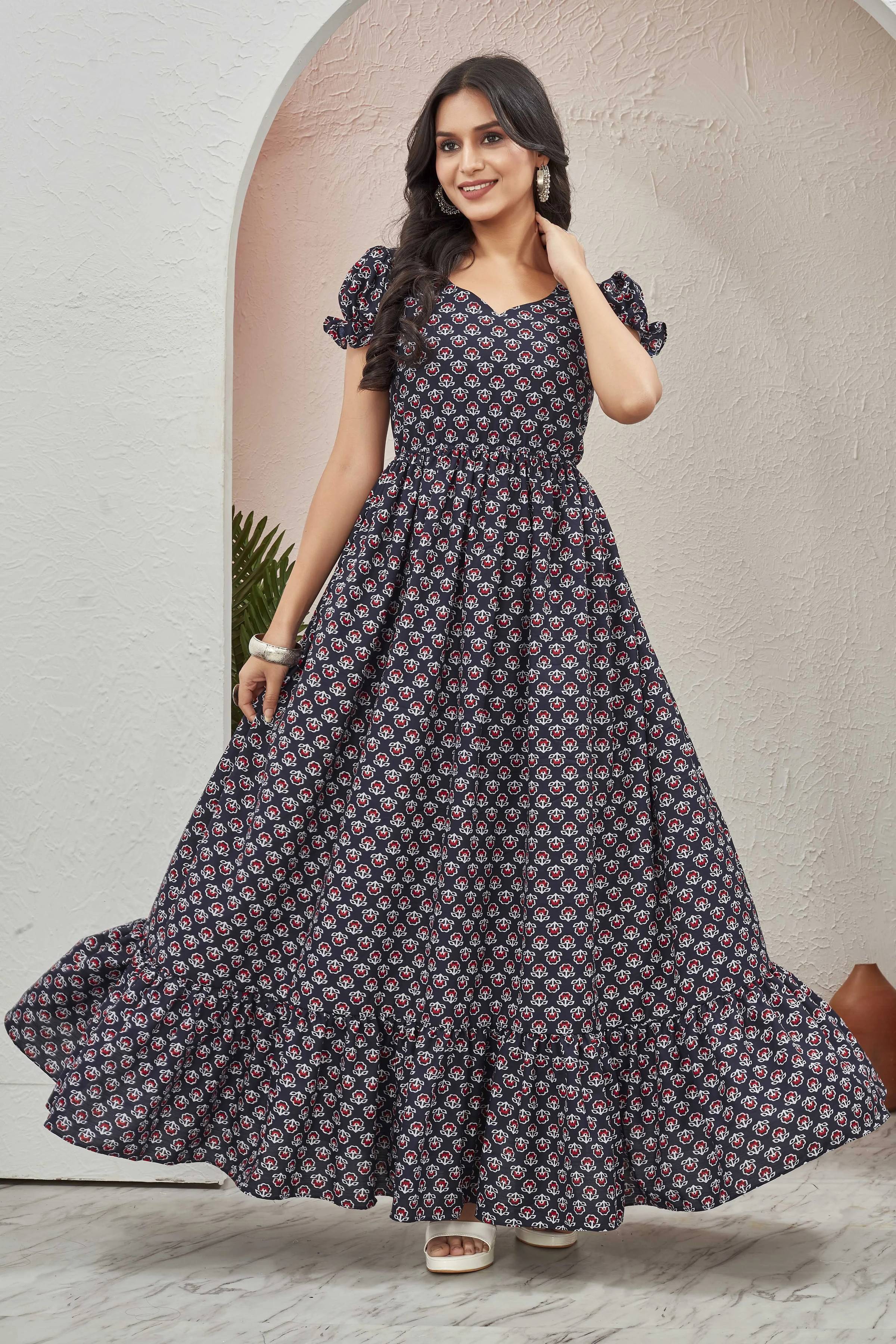 Featuring a printed pattern, this women’s gown brings a soft and stylish look that suits everyone. The print is evenly spread across the fabric, creating a balanced flow that enhances this gown’s shape. Moreover, the subtle tones and delicate looks provide visual interest without appearing heavy. Along with this, the pattern complements the overall silhouette, making it easy to pair with different accessories and footwear choices.