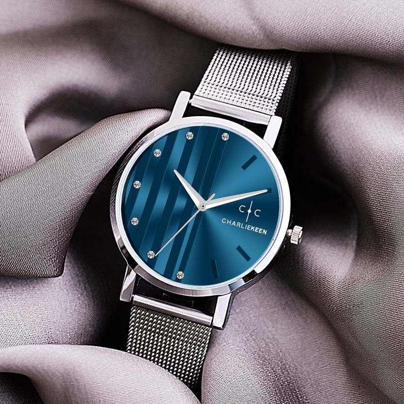 CharlieKeen Elegant Silver Mesh Watch with Blue Dial