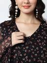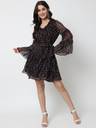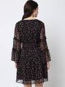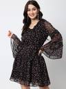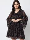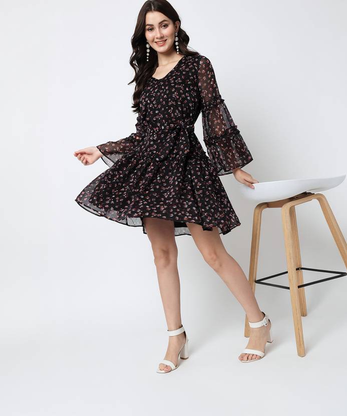 Floral print fit & flare dress V-neck Long, bell sleeve Ruffled detail Above knee length in flared hem Chiffon fabric Zip closure