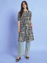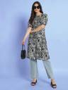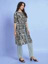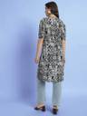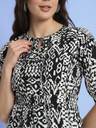 Colour: Black and white Geometric printed Tie-up neck Short puff sleeves A-line shape High slit style Knee length in flared hem Machine weave poly crepe