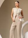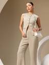 Beige striped waist coat , has a round neck, sleevesless, 2 pockets & front button closure