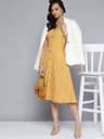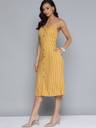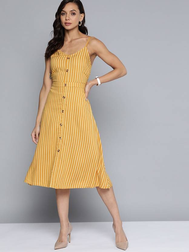 Mustard yellow striped a-line dress Shoulder straps Sleeveless, shoulder straps Smocked detail Midi length in flared hem Concealed zip closure .