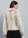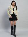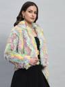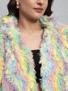 Yellow, blue and green self design open front overcoat, has spread collar, long sleeves and a straight hem