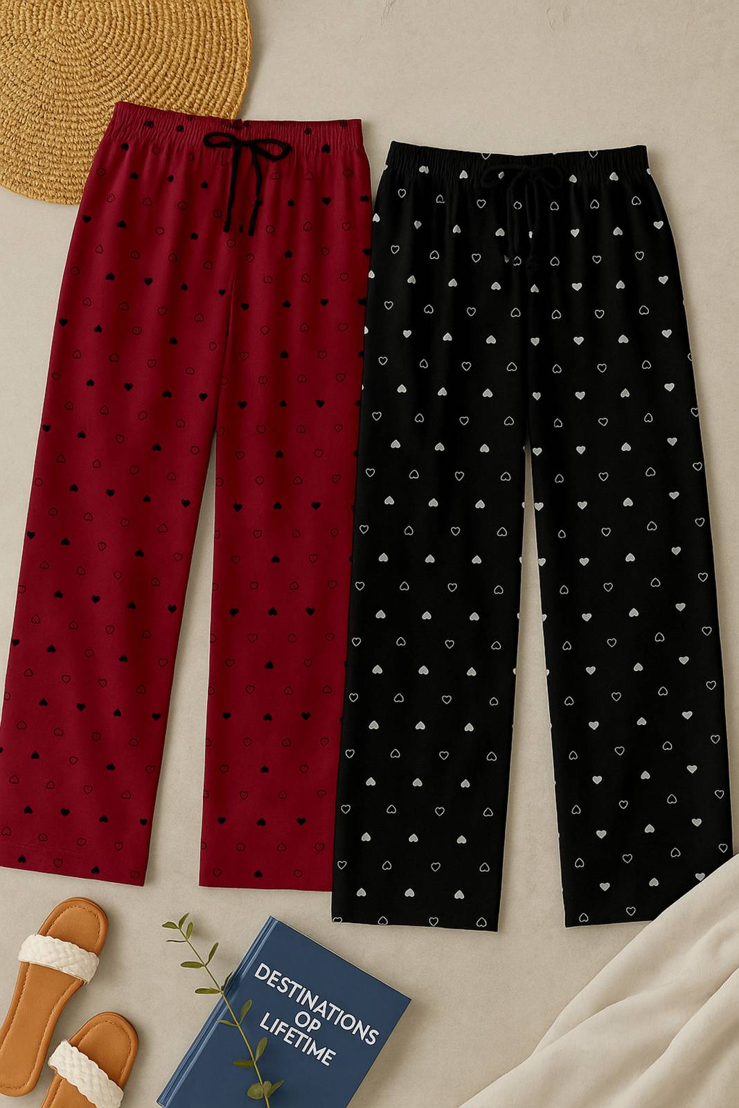 💖 Premium Quality Fabric, Made from ultra-soft & breathable cotton blend for all-day comfort 👗 Trendy Heart Print Design, Stylish all-over heart print to keep your look fashionable even at home 💤 Perfect for Lounge & Sleep, Lightweight & cozy pyjamas ideal for nightwear, lounging, or casual wear 🎀 Elastic Waistband with Drawstring, Adjustable fit ensures maximum comfort & flexibility 🌸 Versatile Pairing, Can be styled with tees, tank tops, or kurtis for a chic casual look 🧺 Easy Care, Machine washable, color fade resistant & durable for long-lasting use 🎁 Value Pack of 2, Comes with 2 stylish pyjamas – perfect for daily wear & gifting