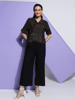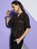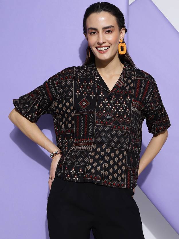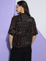 The design features all-over assorted printed motifs, adding a playful and artistic touch to its design. These patterns are carefully placed, creating a visually interesting look without being too bold or overwhelming. The variety in the motifs gives the shirt a lively yet balanced appearance, making it a suitable choice for a fun and casual outfit.