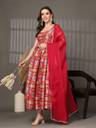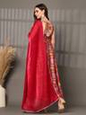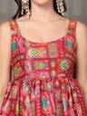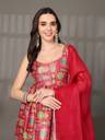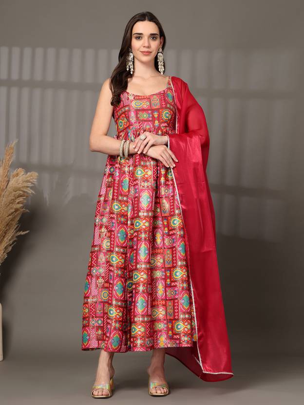 Pink Multi-Print Silk Flared Gown with Organza Dupatta Set. Crafted from luxurious silk, this gown combines intricate prints with a flared silhouette for a look that is both contemporary and timeless, making it an ideal choice for weddings, festive events, or special evening occasions.