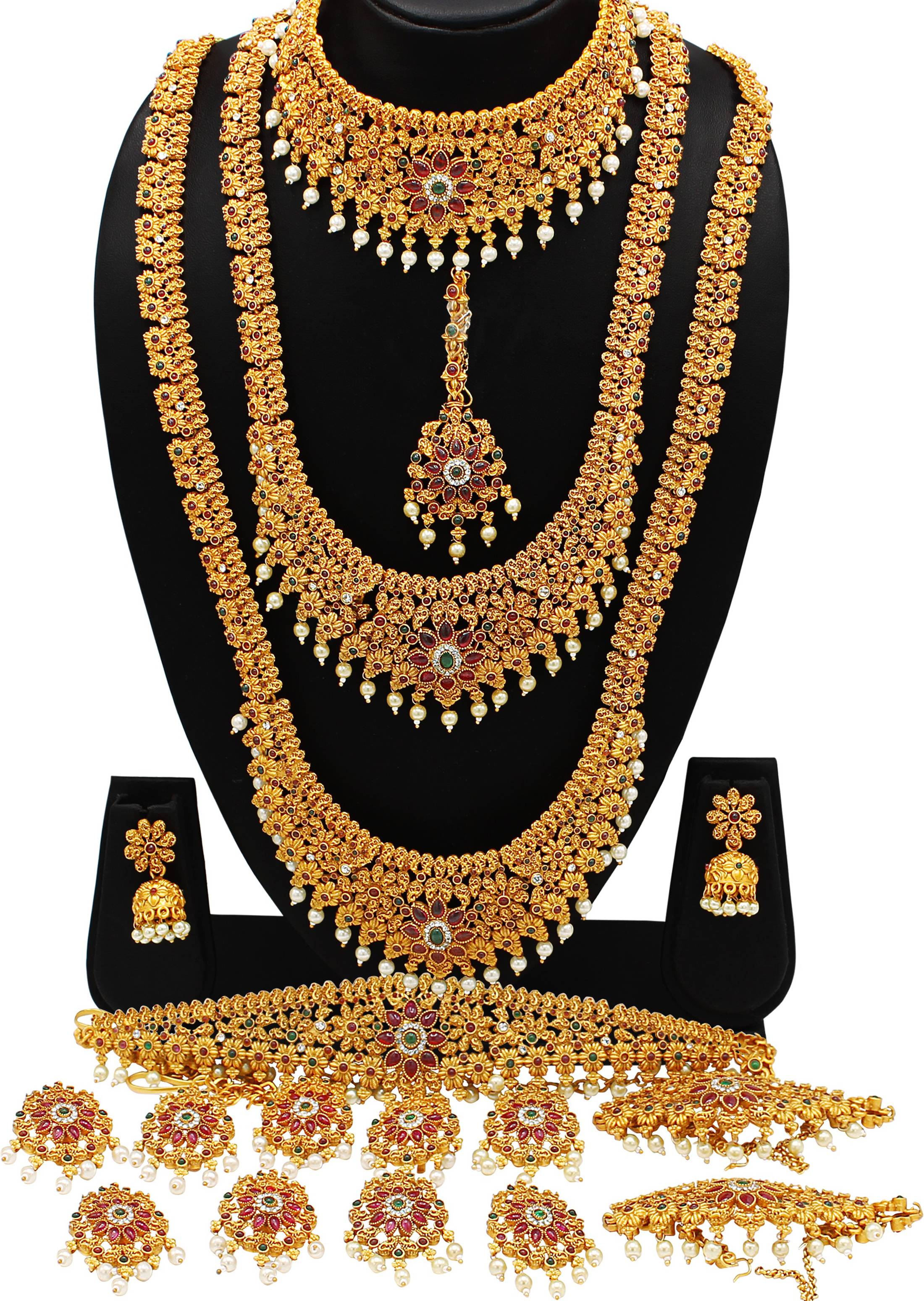 1 Choker Necklace Set 1 Long Necklace Set 1 Kamarband 1 Maang Tika 1 Pair of Earrings Beautiful Ethnic Traditional Geometric & Floral inspired Bridal Necklace Set With Red and Green Kundan Stone, Polki & White Pearls. A Perfect Necklace Bridal Set for every Indian Girl or Women for any of the bridal or auspicious occasion. Weight 238 Gms Double Quality Check passed Superior quality and skin friendly: high quality as per both domestic and international standards that makes it perfectly fall on the body with no allergy to the skin. it has been made from toxic free materials anti-allergic and safe for skin. it can be worn over long time periods without any complains such as itching, rashes and swelling. Manufactured by Highest and premium quality material this product assures to remain in its original glory even after years of usage. Lifetime Gift : An ideal Wedding, valentine, birthday, anniversary gift your loved ones. women love jewellery; specially traditional jewellery adore a women. they wear it on different occasion they have huge significance on, wedding, engagement, anniversary and festive time. We can also recommend women to also wear it on regular basics. jewellery manufacturer who not only manufacture the jewellery but also resell it to many of the resellers. With 100% genuine quality product, with complete quality check for more product options, please visits our store . Please make sure you give your orders with with full confidence as you are placing the order to the direct manufacturer.