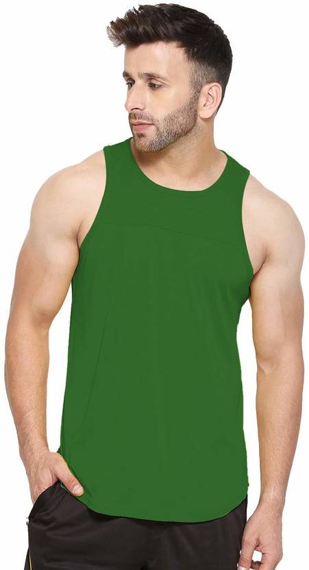 CHKOKKO Gym Sports Tank top Sleeveless Men Solid Round Neck Polycotton Green T-Shirt
