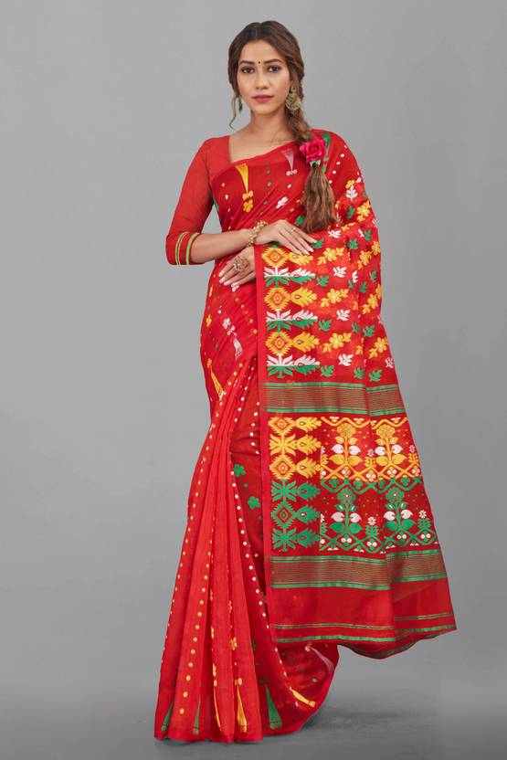 CHOICEIT Woven, Embellished Jamdani Jacquard, Cotton Silk Saree (Red)