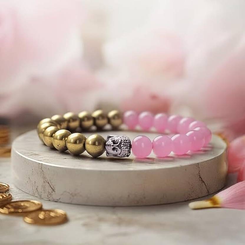 Serenity Fusion Bracelet – Rose Quartz Glass Beads, Golden Pyrite & Silver Buddha Head Charm for Inner Balance