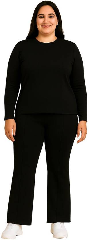 Look stylish and feel confident with this solid tracksuit set, designed for comfort and movement. Made from soft, stretchable fabric, it features a full-sleeve round neck top paired with flared bottoms that offer a flattering, relaxed fit for curvy body types.