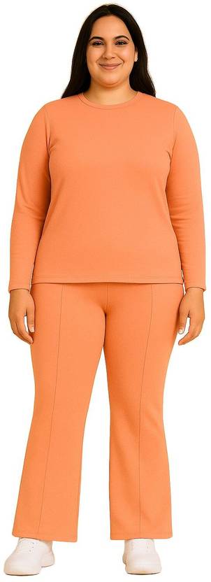 Look stylish and feel confident with this solid tracksuit set, designed for comfort and movement. Made from soft, stretchable fabric, it features a full-sleeve round neck top paired with flared bottoms that offer a flattering, relaxed fit for curvy body types.