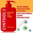 Cinthol Head to Toe body wash � an all-in-one cleansing solution for your body, hair and face. Made with Argan Oil, it strengthens your hair from the roots and makes them soft and shiny. Powered with germ-protection and Neem actives, it deep-cleanses your scalp and skin. Its icy-cool Menthol extracts gives you a blast of freshness, while the active deo fragrance leaves you feeling fresh, all day long.