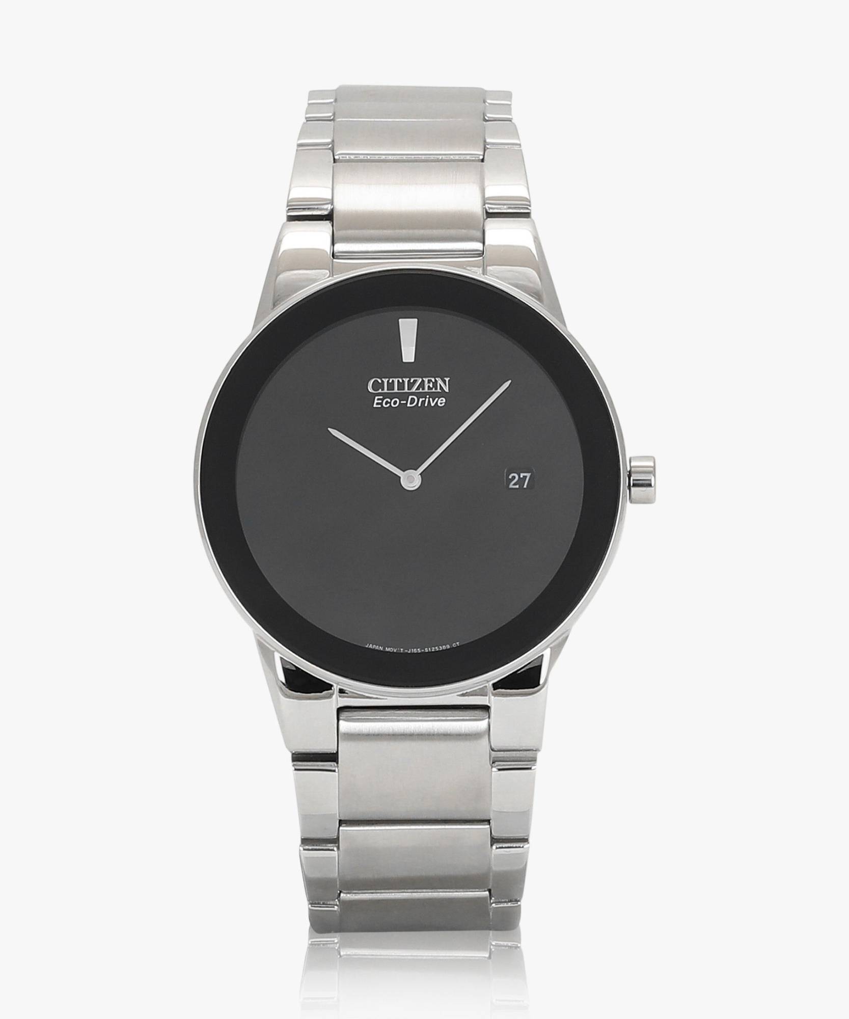 Axiom's refined yet sleek design offers a day-to-night fashion options for the avid trendsetter. Available in men's and ladies', featuring a stainless steel case and bracelet with a black dial and the intriguing feature of edge-to-edge glass and date. Featuring our Eco-Drive technology powered by light, any light. Never needs a battery. Caliber number J165.Eco-Drive technology powered by light, any light. No need to change battery