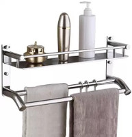 The two-bar towel rod gives the shelf additional strength and stability. Bath towels and other bulkier things may be hung without risk of them bending or falling. Bathrooms frequently include moisture and humidity, but this set is resistant to both. This resistance stops rust from growing, assuring the shelf's durability. Although quality stainless steel bathroom shelves may cost more upfront, they are more affordable in the long term due to their durability and low maintenance needs.