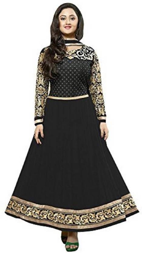 Clickedia Women Georgette Black Embroidered Anarkali Suit- Dress Material Fashionable semi-sticthed suit, top- Georgette, Embroidered , alterable upto size 40", bottom- Santoon , duppatta- naznin - 2.2 m, work as in picture,