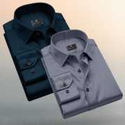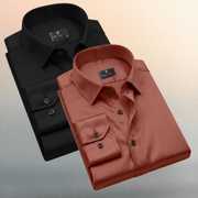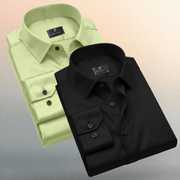 This is a men's solid navy blue long-sleeved shirt featuring a classic collar and dark buttons. The fabric has a smooth texture with a subtle sheen, suggesting a satin or silk-blend material. The sleeves are designed to be rolled up, adding to its versatile style. The shirt has a tailored fit and a curved hem. It can be paired with formal trousers for a sophisticated look or with chinos for a smart-casual ensemble.