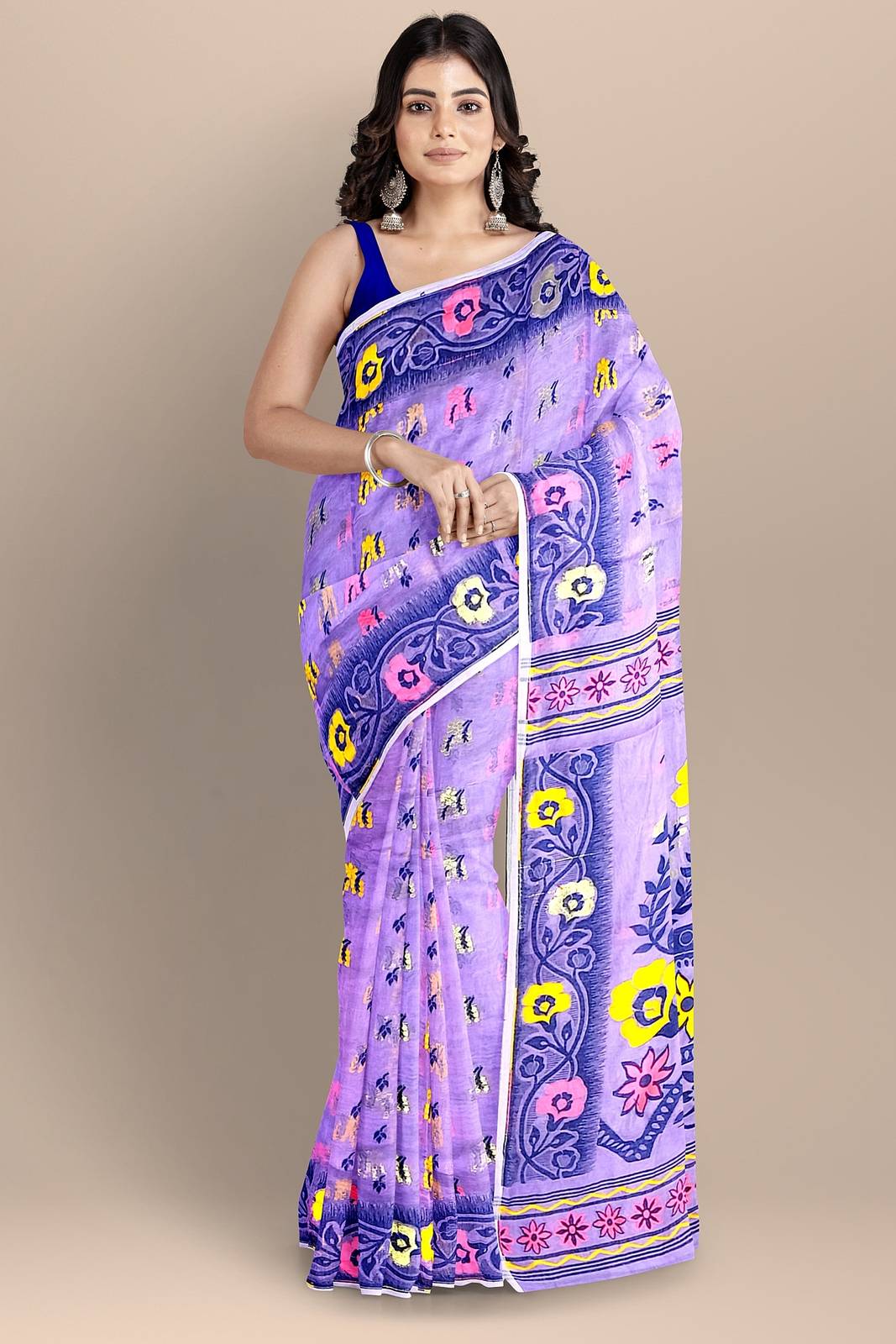 The Multicolor color dhakai jamdani saree is crafted with multicolor color resham made Buti all over the body. The dhakai jamdani sarees for women's pallu have multi color resham made designer work. Self color resham made designer border all along. No blouse piece. dhakai jamdani saree images with price is available for customers. Looking for a perfect Dhakai Jamdani saree to add to your collection? Look no further than our online store! We offer an extensive collection of authentic Dhakai Jamdani sarees that are crafted with the finest cotton threads and woven with intricate motifs using the discontinuous weft technique. Our sarees are lightweight, breathable, and easy to drape, making them perfect for all occasions. Our collection features a range of colors, designs, and patterns, ensuring that there is something for everyone. From floral and paisley motifs to geometric patterns and distinctive borders, our sarees are a perfect blend of tradition and modernity. Whether you're looking for a saree for a wedding, festival, or casual wear, we've got you covered. At our online store, we prioritize customer satisfaction and offer fast delivery, easy returns, and secure payment options. We also provide detailed product descriptions, customer reviews, and ratings to help you make an informed buying decision. Our affordable prices, quality products, and exceptional customer service have made us a trusted e-commerce platform. So why wait? Browse our collection of Dhakai Jamdani sarees today and elevate your wardrobe with a timeless piece of art! Indulge in the exquisite elegance of Dhakai Jamdani sarees, a traditional form of weaving that originated in Bangladesh. Our collection features an array of breathtaking Dhakai Jamdani sarees that are handcrafted with the utmost care and precision, using fine cotton threads and woven with the discontinuous weft technique. For those looking for a touch of luxury, our collection also includes Dhakai Jamdani silk sarees that are perfect for formal occasions or adding a glamorous twist to your wardrobe. Whether you're in Bangladesh or Kolkata, we offer competitive prices on our Dhakai Jamdani sarees, making it easy for you to find the perfect saree for your budget. Our collection of Dhakai Jamdani sarees is designed to cater to women of all ages and styles. From traditional designs to contemporary interpretations, we offer a wide range of Dhakai Jamdani sarees that are perfect for all occasions. Our collection also includes Dhakai Jamdani kurtis, blouses, and suits, all featuring the same intricate designs and high-quality craftsmanship as our sarees. At our online store, we prioritize customer satisfaction and offer detailed product descriptions, customer reviews, and ratings to help you make an informed buying decision. We also provide fast delivery, easy returns, and secure payment options, ensuring a seamless shopping experience for all our customers. Shop our collection of Dhakai Jamdani sarees and other traditional wear today and experience the timeless beauty of this iconic style!