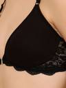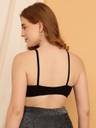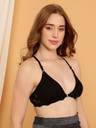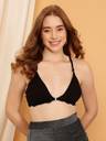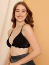 Black half-coverage open front plunge bra, has non-padded and non-wired seamless cups, elasticated and adjustable shoulder straps, insert-and-slide closure on the front