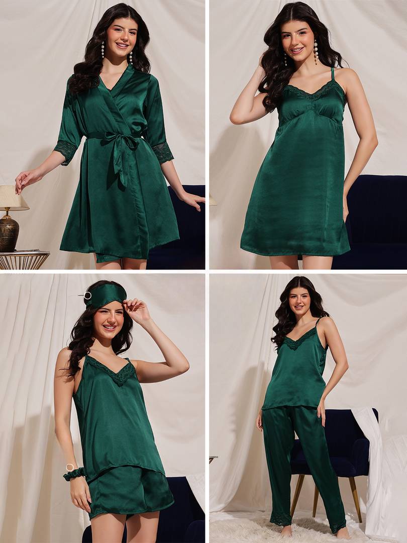 This luxurious 5-piece dark green bridal nightwear gift set is crafted from soft, premium satin for an indulgent feel. The set includes a babydoll, robe, cami top, shorts, and pyjama—each thoughtfully designed with exquisite lace accents and elegant detailing. The babydoll features padded cups, a lace-trimmed V-neckline, and adjustable criss-cross straps at the back. The robe comes with 3/4th sleeves, lace-detailed hems, and a matching satin belt. The cami top also includes lace at the neckline, slender straps, and a stylish criss-cross back. Both shorts and pyjama bottoms have elasticated waistbands and pockets, with the pyjama further enhanced with lace hems. The set is completed with a matching satin scrunchie and eye mask—perfect as a bridal gift.