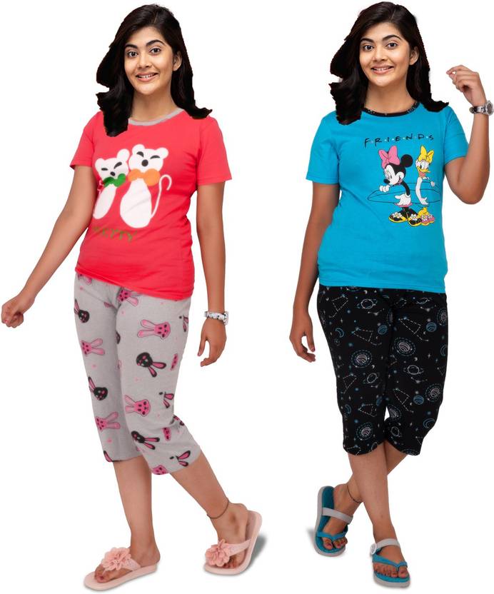 CNT Kids Nightwear Girls Printed Cotton Blend (Multicolor Pack of 2)
