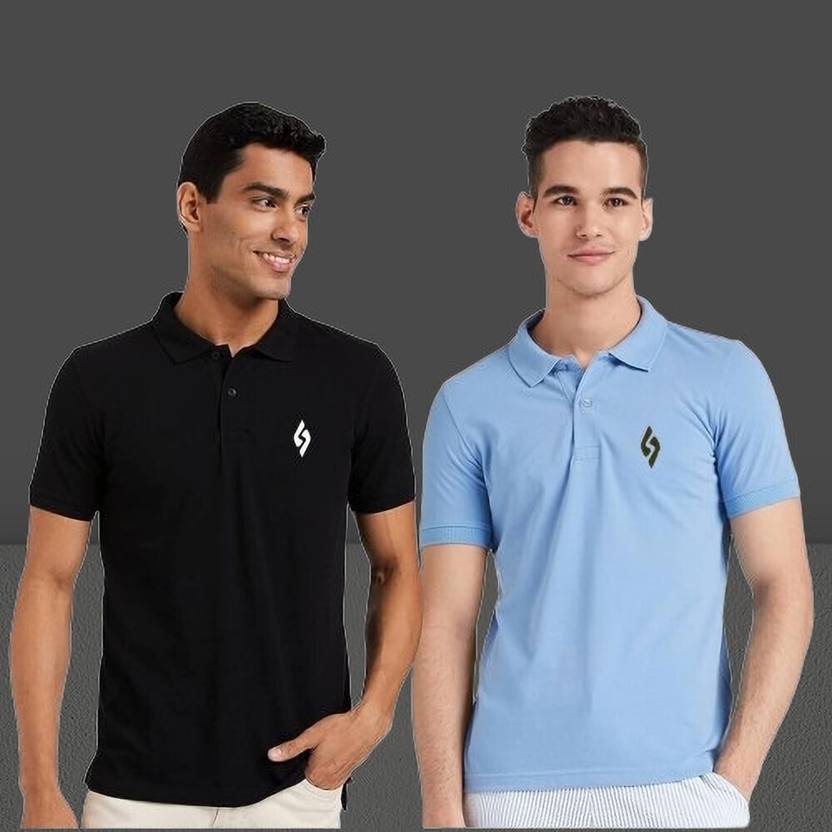 cnw Solid Men Polo Neck Black, Light Blue T-Shirt