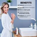 It lightens the skin tone by preventing the production of tyrosine, which is responsible for producing melanin. It also works as an antioxidant for your skin. Great for minimizing the appearance of age spots & sun damage.