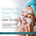 Mother of Pearl Face Scrub deeply exfoliates - Mother of Pearl Face Scrub naturally exfoliates, deeply cleans pores & removes dead skin cells so as to give a soft, smooth & radiant looking skin., Mother of Pearl Powder encourages skin cells to produce healthy collagen which results in plump & glowing skin., Kaolin works as an excellent exfoliator by drawing out impurities from the pores of the skin., Cucumber Extract hydrates, soothes the skin & relieves the skin from itchiness., Jojoba Oil keeps the skin hydrated, supple & also prevents bacterial infection by preventing build-up of bacteria in the pores., Vitamin softens the skin, stops it from losing moisture, adds glow & make skin look smooth & healthy., The secret - Follow with Vitamin C Clay Face Mask.