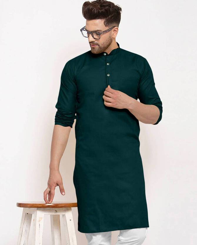 A men's solid kurta is a traditional Indian attire that exudes simplicity and elegance. It is a versatile garment that can be worn for various occasions, ranging from casual gatherings to formal events. The term "solid" refers to the color of the kurta, which is typically a single, uninterrupted shade without any intricate patterns or designs.The solid kurta is typically made from comfortable and breathable fabrics such as cotton, linen, silk, or blends, ensuring a relaxed and airy feel. It is characterized by its straight-cut silhouette, often reaching just above the knee or slightly below, and features a round neckline with a buttoned or slit placket.One of the distinctive features of a solid kurta is its minimalistic design, allowing the focus to remain on the color and fabric texture. This makes it a versatile piece of clothing that can be accessorized in various ways to achieve different looks. Men can pair a solid kurta with contrasting or complementary churidar pants, Aligarh pants, or even straight-cut trousers for a modern twist.Solid kurtas are often chosen in classic colors such as white, beige, black, navy blue, or earthy tones like olive green and maroon. However, the color options are virtually limitless, enabling individuals to select shades that resonate with their personal style and the occasion they are dressing for.For a casual look, a solid kurta can be worn with minimalistic footwear like sandals or slip-ons, along with subtle accessories like a wristwatch or a simple bracelet. On the other hand, to create a more formal appearance, it can be paired with embroidered footwear like mojaris, accessorized with a brooch or a pocket square, and complemented by a well-fitted blazer or Nehru jacket.In summary, a men's solid kurta is a classic and timeless piece of clothing that combines traditional aesthetics with contemporary versatility. Its understated elegance and wide range of styling possibilities make it an essential addition to any gentleman's wardrobe, suitable for both cultural celebrations and modern-day fashion statements.