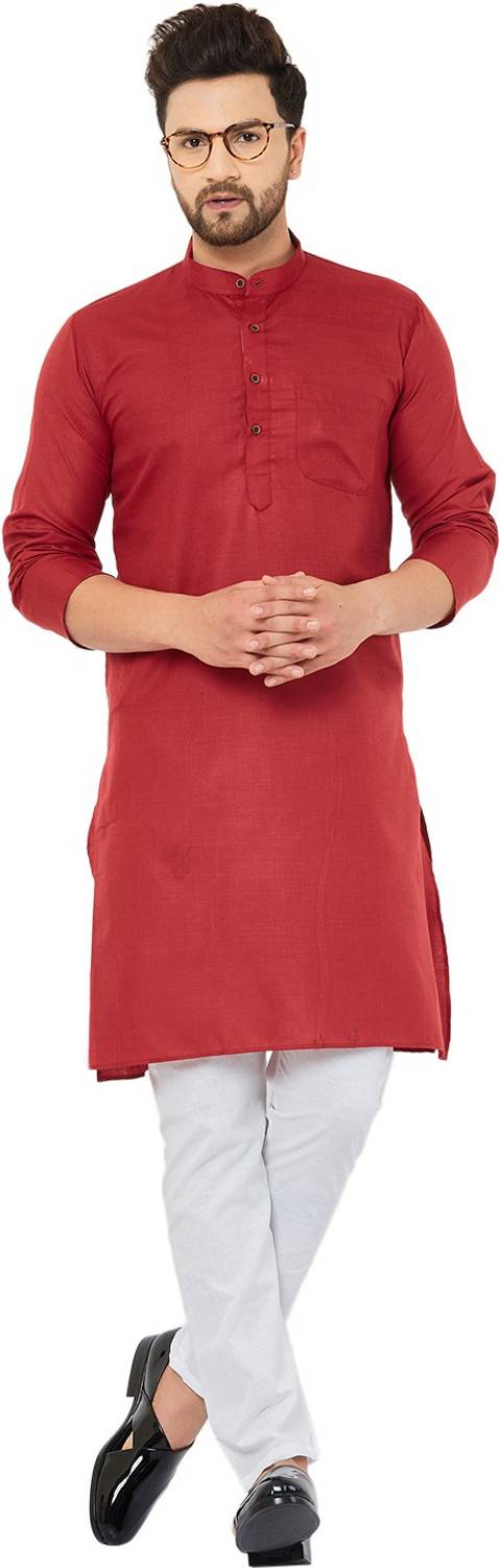 A men's solid kurta is a traditional Indian attire that exudes simplicity and elegance. It is a versatile garment that can be worn for various occasions, ranging from casual gatherings to formal events. The term "solid" refers to the color of the kurta, which is typically a single, uninterrupted shade without any intricate patterns or designs.The solid kurta is typically made from comfortable and breathable fabrics such as cotton, linen, silk, or blends, ensuring a relaxed and airy feel. It is characterized by its straight-cut silhouette, often reaching just above the knee or slightly below, and features a round neckline with a buttoned or slit placket.One of the distinctive features of a solid kurta is its minimalistic design, allowing the focus to remain on the color and fabric texture. This makes it a versatile piece of clothing that can be accessorized in various ways to achieve different looks. Men can pair a solid kurta with contrasting or complementary churidar pants, Aligarh pants, or even straight-cut trousers for a modern twist.Solid kurtas are often chosen in classic colors such as white, beige, black, navy blue, or earthy tones like olive green and maroon. However, the color options are virtually limitless, enabling individuals to select shades that resonate with their personal style and the occasion they are dressing for.For a casual look, a solid kurta can be worn with minimalistic footwear like sandals or slip-ons, along with subtle accessories like a wristwatch or a simple bracelet. On the other hand, to create a more formal appearance, it can be paired with embroidered footwear like mojaris, accessorized with a brooch or a pocket square, and complemented by a well-fitted blazer or Nehru jacket.In summary, a men's solid kurta is a classic and timeless piece of clothing that combines traditional aesthetics with contemporary versatility. Its understated elegance and wide range of styling possibilities make it an essential addition to any gentleman's wardrobe, suitable for both cultural celebrations and modern-day fashion statements.