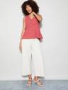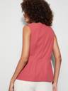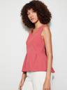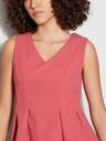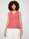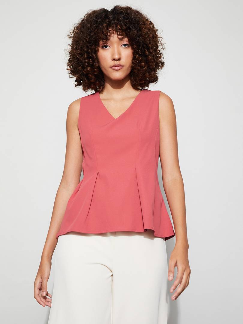 Peplum top with v-neck, sleeveless, solid surface, and pleated detail.