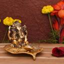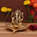 Collectible India Ganesha on Leaf Idol Showpiece with Diya Stand Oil Lamp For Puja - Diya For Home Temple Mandir Decoration Aluminium Table Diya (Height: 4.5 inch)