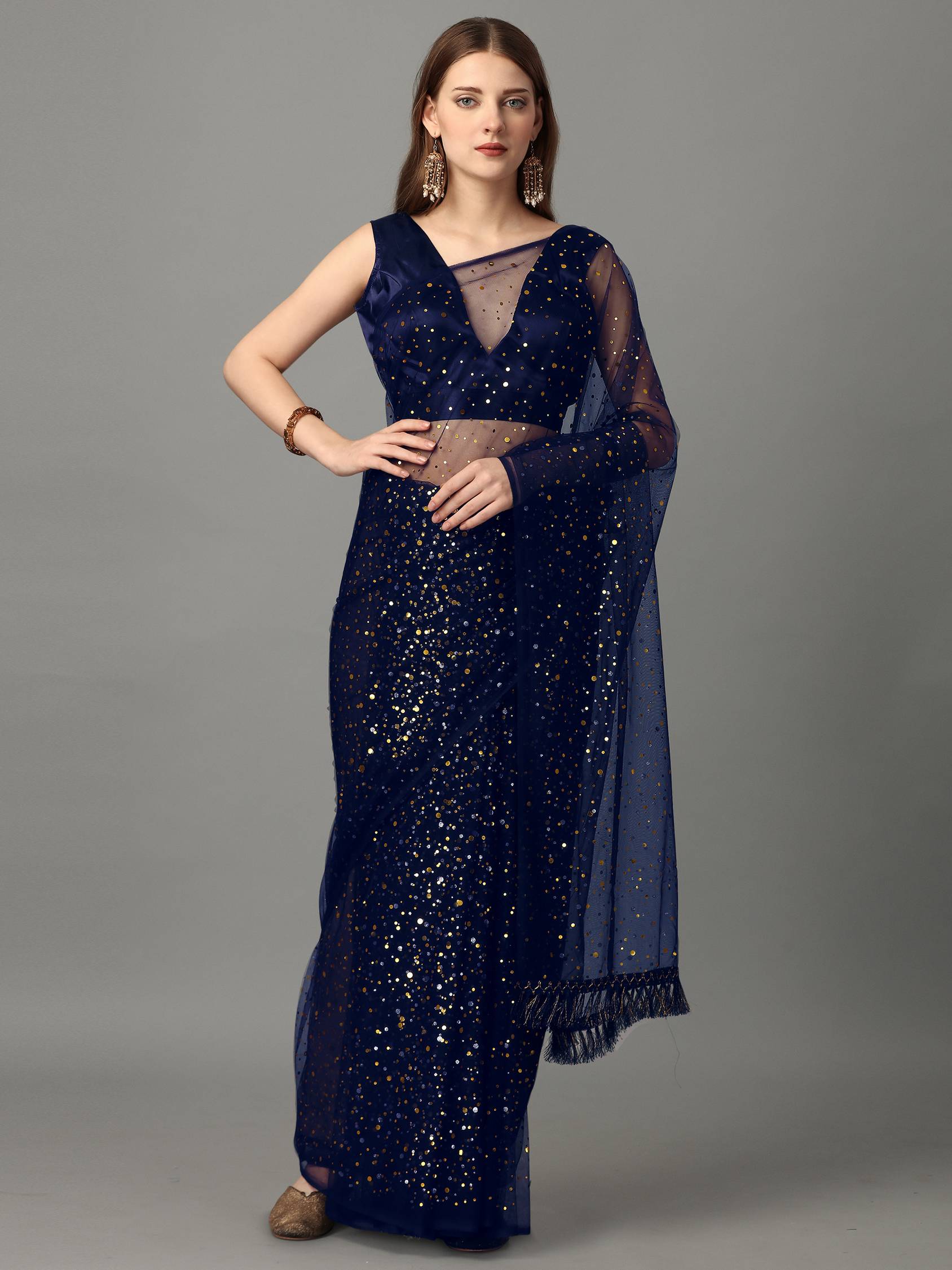 color bucket Polka Print Bollywood Net Saree (Dark Blue)
