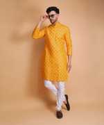 This men polycotton blend straight kurta can be worn in pujas, festival, haldi rasam, wedding sangeet.